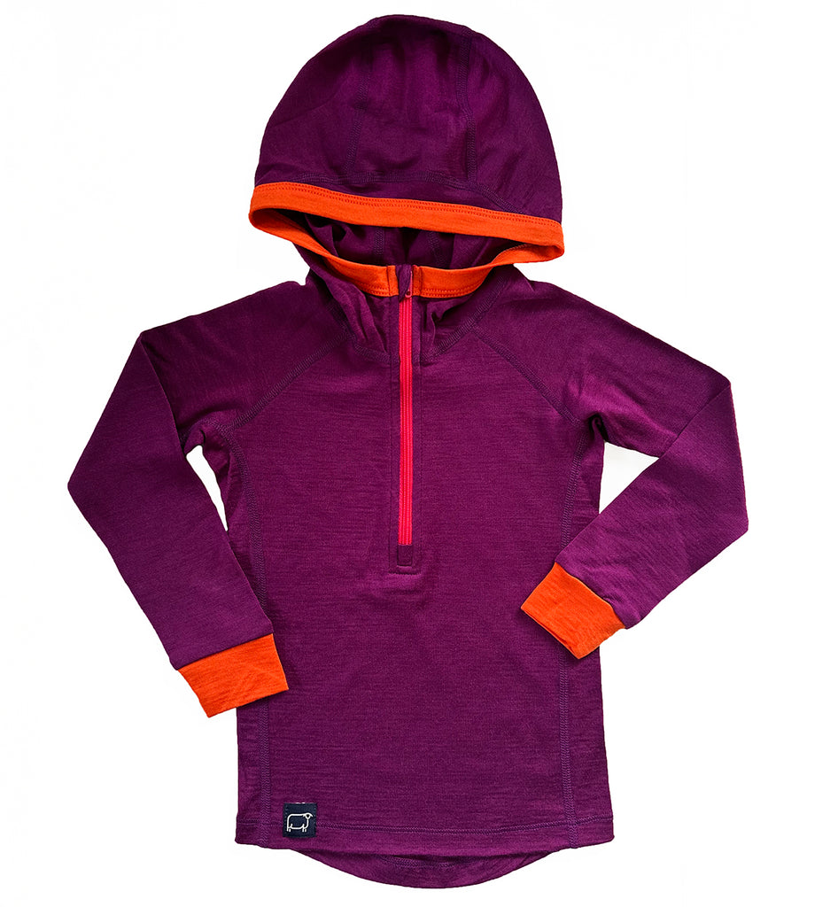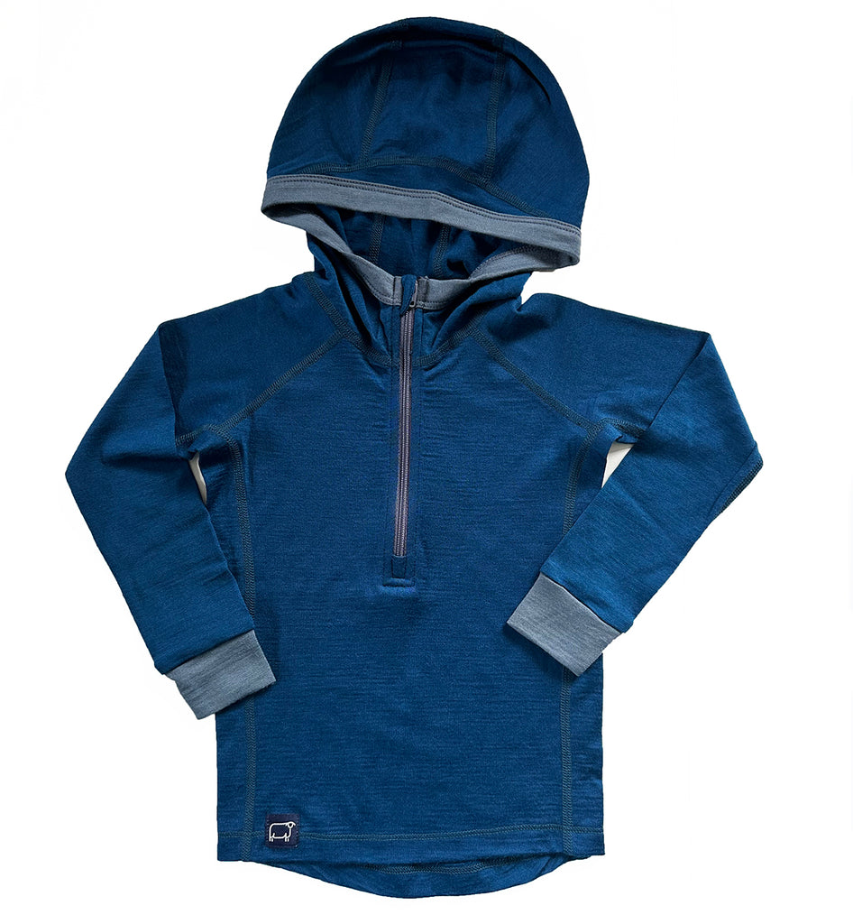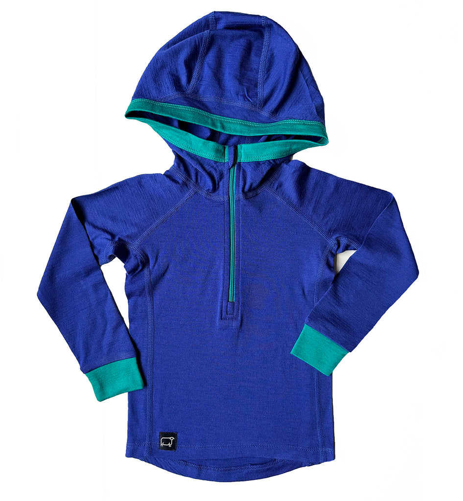 It's all your little adventurer needs in a Base Layer Hoodie. Pure Merino, plus all the technical details uniting comfort and performance for a top-notch garment. With a half zip for versatility and easy on and offs, and a snug-fitting hood to fit easily under jackets and helmets. Finished with flat lock seams for added comfort and durability.