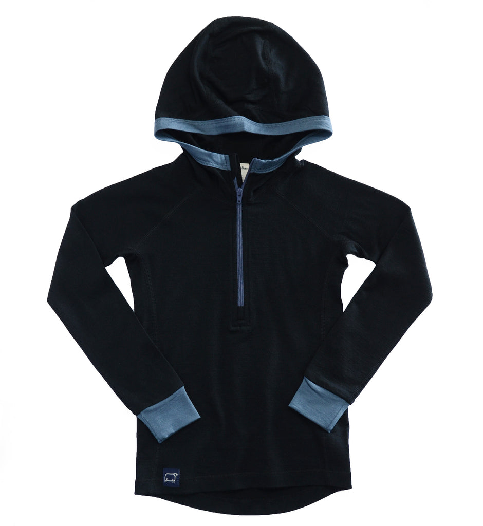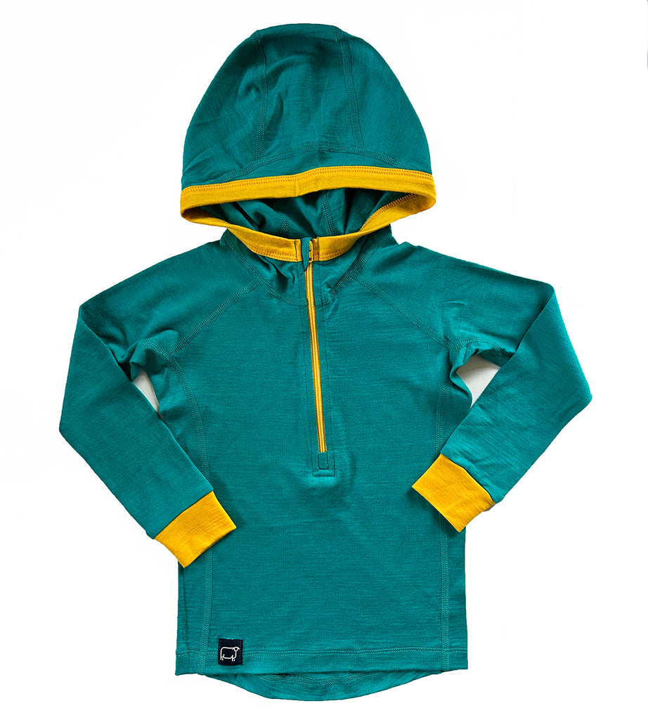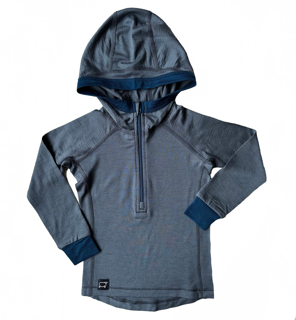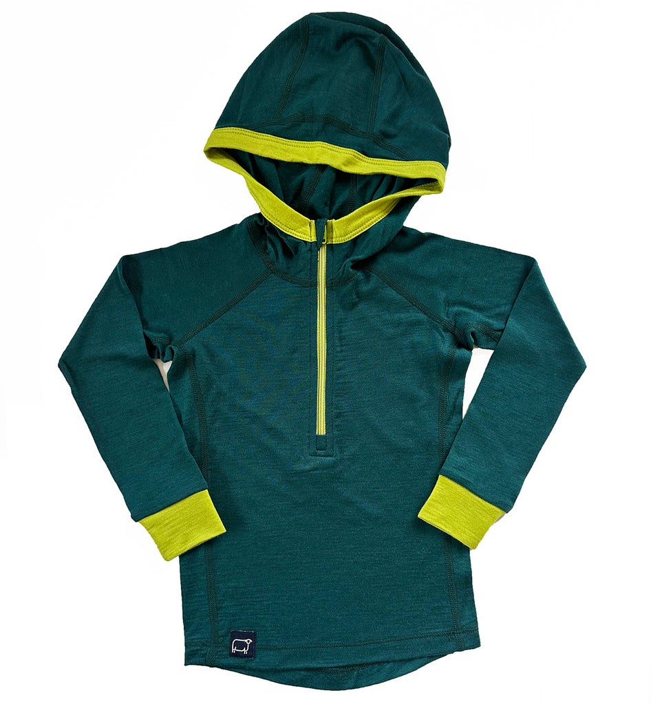 It's all your little adventurer needs in a Base Layer Hoodie. Pure Merino, plus all the technical details uniting comfort and performance for a top-notch garment. With a half zip for versatility and easy on and offs, and a snug-fitting hood to fit easily under jackets and helmets. Finished with flat lock seams for added comfort and durability.